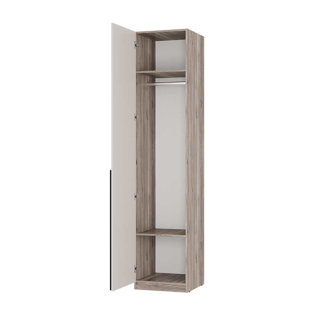 Модульная гостиная «Урбан» – стильное и компактное решение для Вашей квартиры. Комплект включает в себя пенал с полками и штангой, навесные шкафы (2 шт.) со стеклом и полками, горизонтальную полку с тремя закрытыми отделами и навесную тумбу с выдвижными ящиками. Минималистичное цветовое сочетание "Дуб Смоки" и "Кашемир" добавят пространству спокойствия и тепла.
