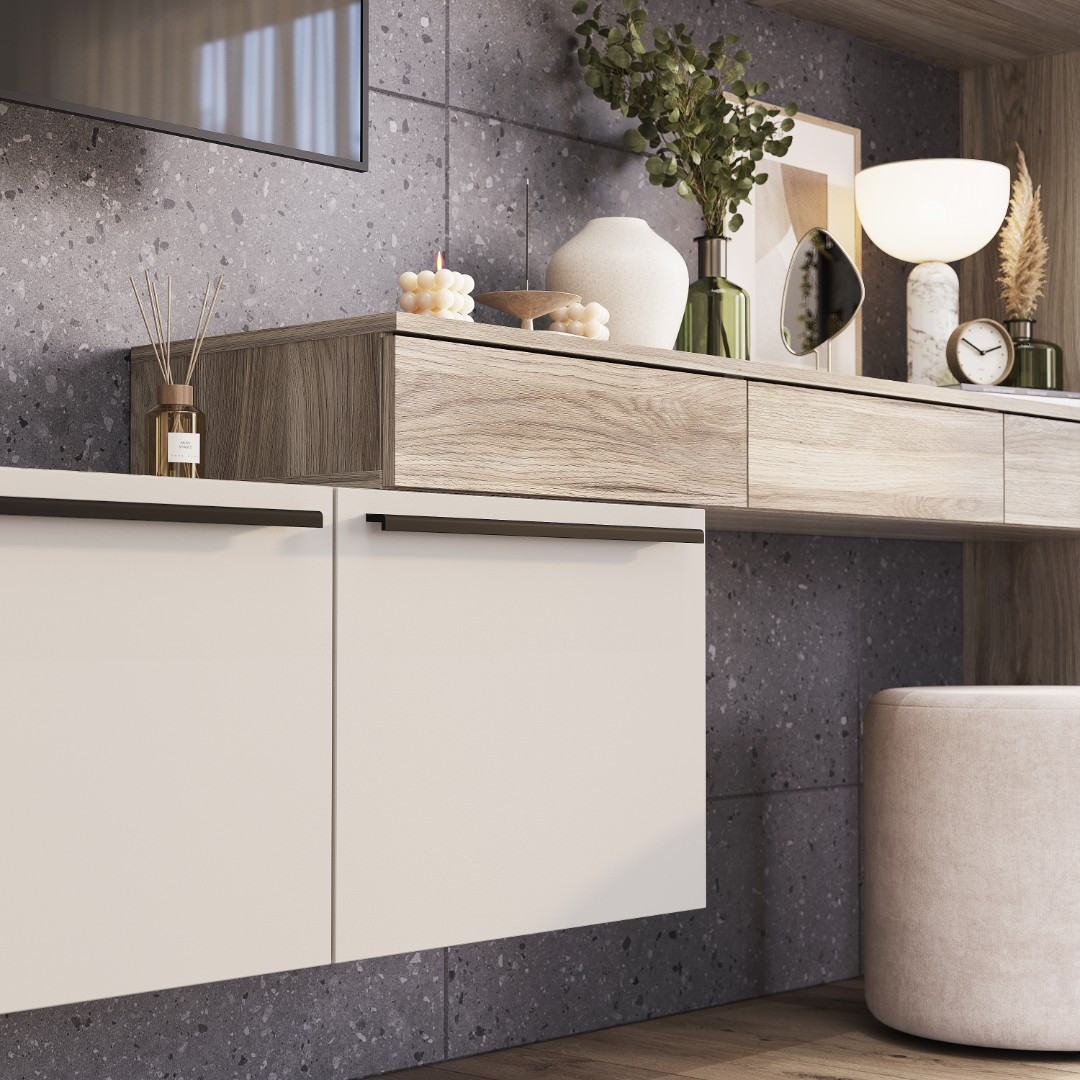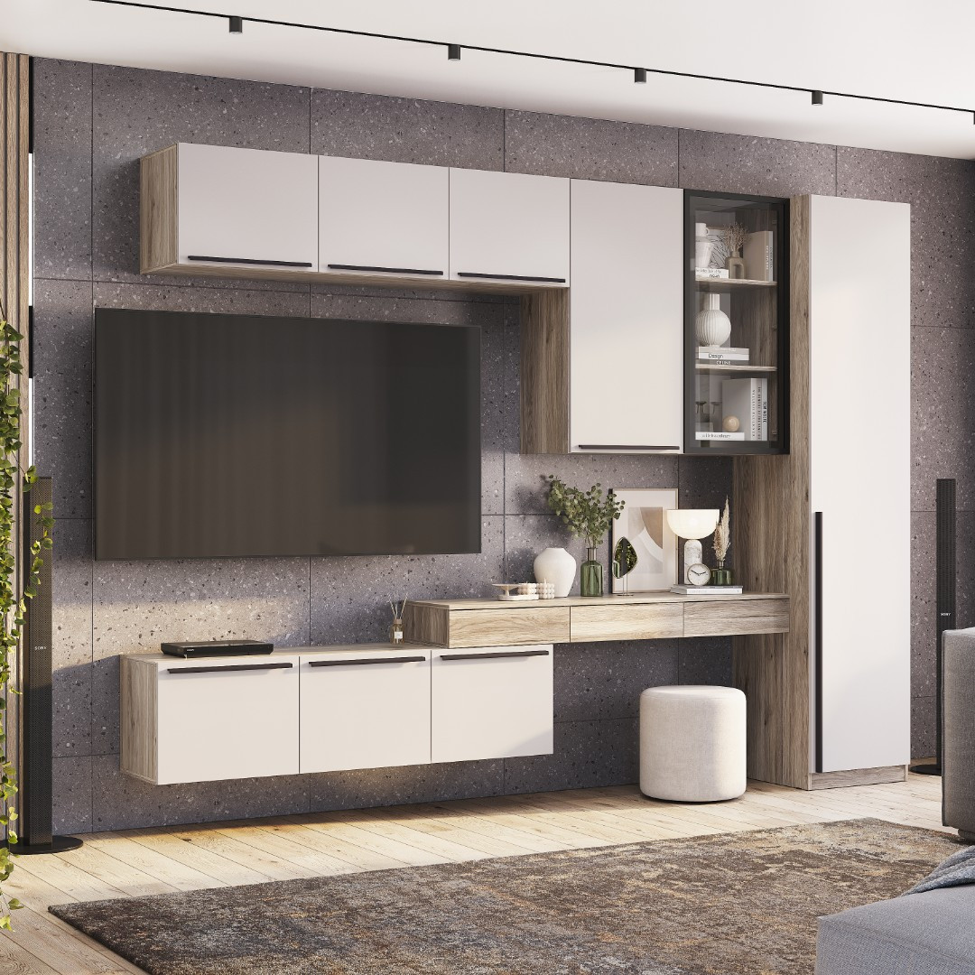 Модульная гостиная «Урбан» – стильное и компактное решение для Вашей квартиры. Комплект включает в себя горизонтальные полки (2 шт.) с тремя закрытыми отделами, навесные шкафы с открытым и закрытым пространством, навесную тумбу с выдвижными ящиками и пенал с полками и штангой. Минималистичное цветовое сочетание "Дуб Смоки" и "Кашемир" добавят пространству спокойствия и тепла.