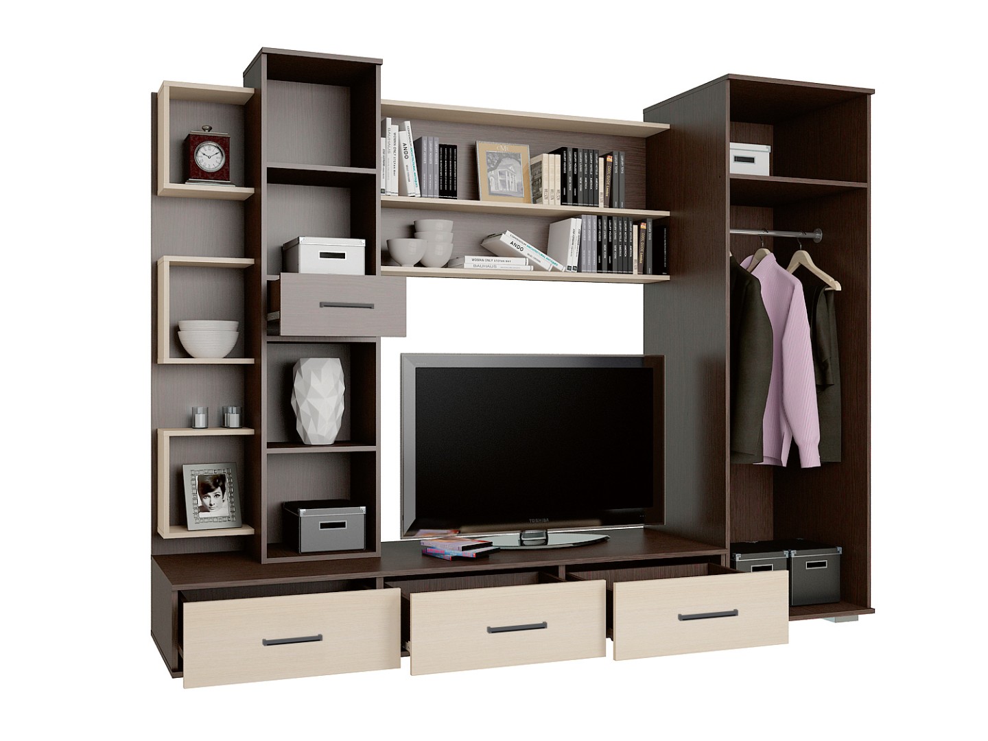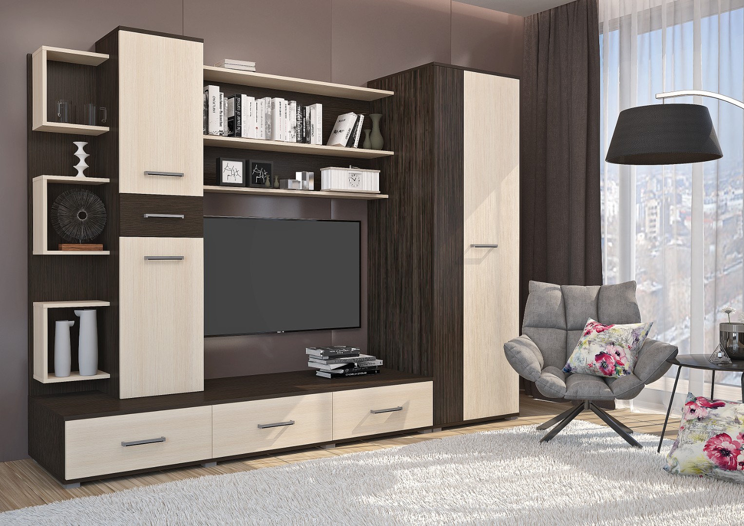 Модульная коллекция мебели для обустройства гостиной. Материал: ЛДСП, МДФ покрытый плёнкой.