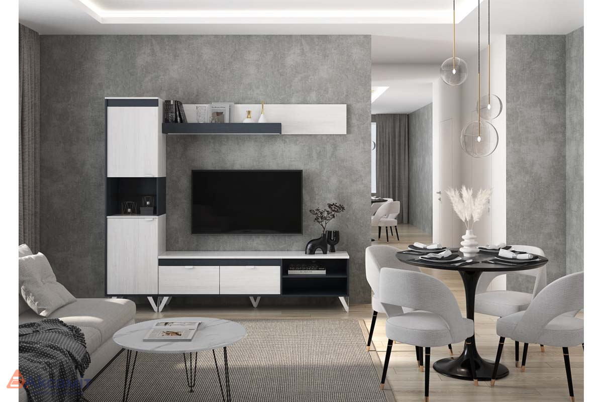 Комплект мебели для гостиной в стиле сканди с белыми глянцевыми фасадами. Материал: ЛДСП.