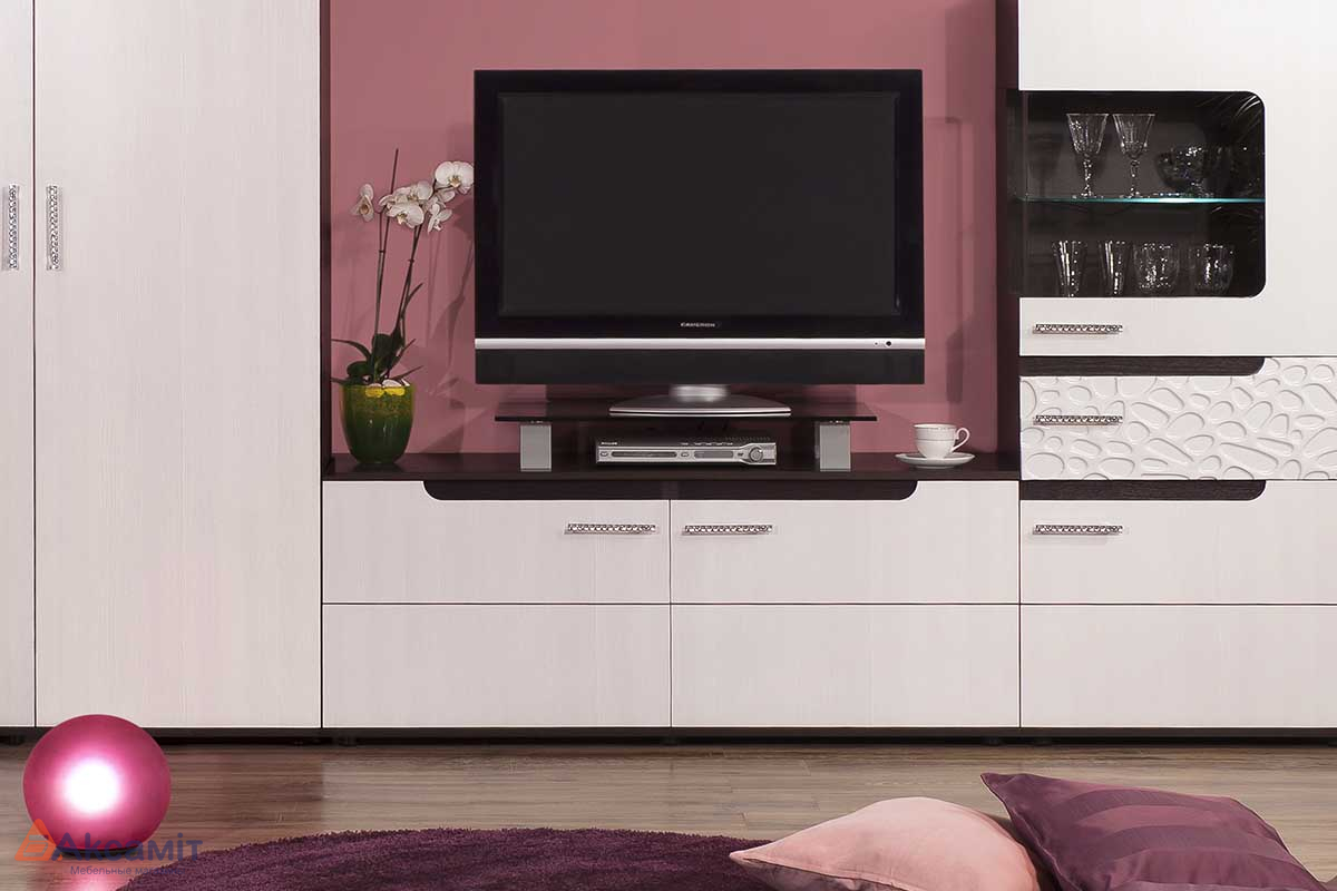 Классический Венге, светлая текстура Бодега, фактурные «волшебные пузырьки» на рельефных глянцевых фасадах, Металлические ручки со стразами - украсят Вашу гостиную, придадут ей шик и изысканность.
