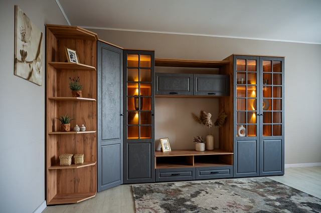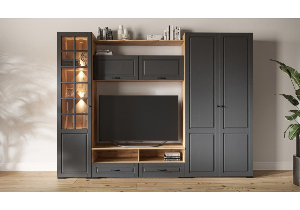 - Природное сочетание декоров графитового оттенка и золотистого дуба с выразительной текстурой натурального дерева добавляет стенке уникальный характер и теплоту, делает интерьер особенно привлекательным.