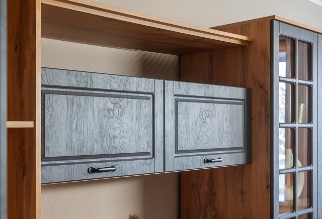 Контрастные верхние топы на шкафах вместо карнизов делают композицию завершенной, придают стильный вид.