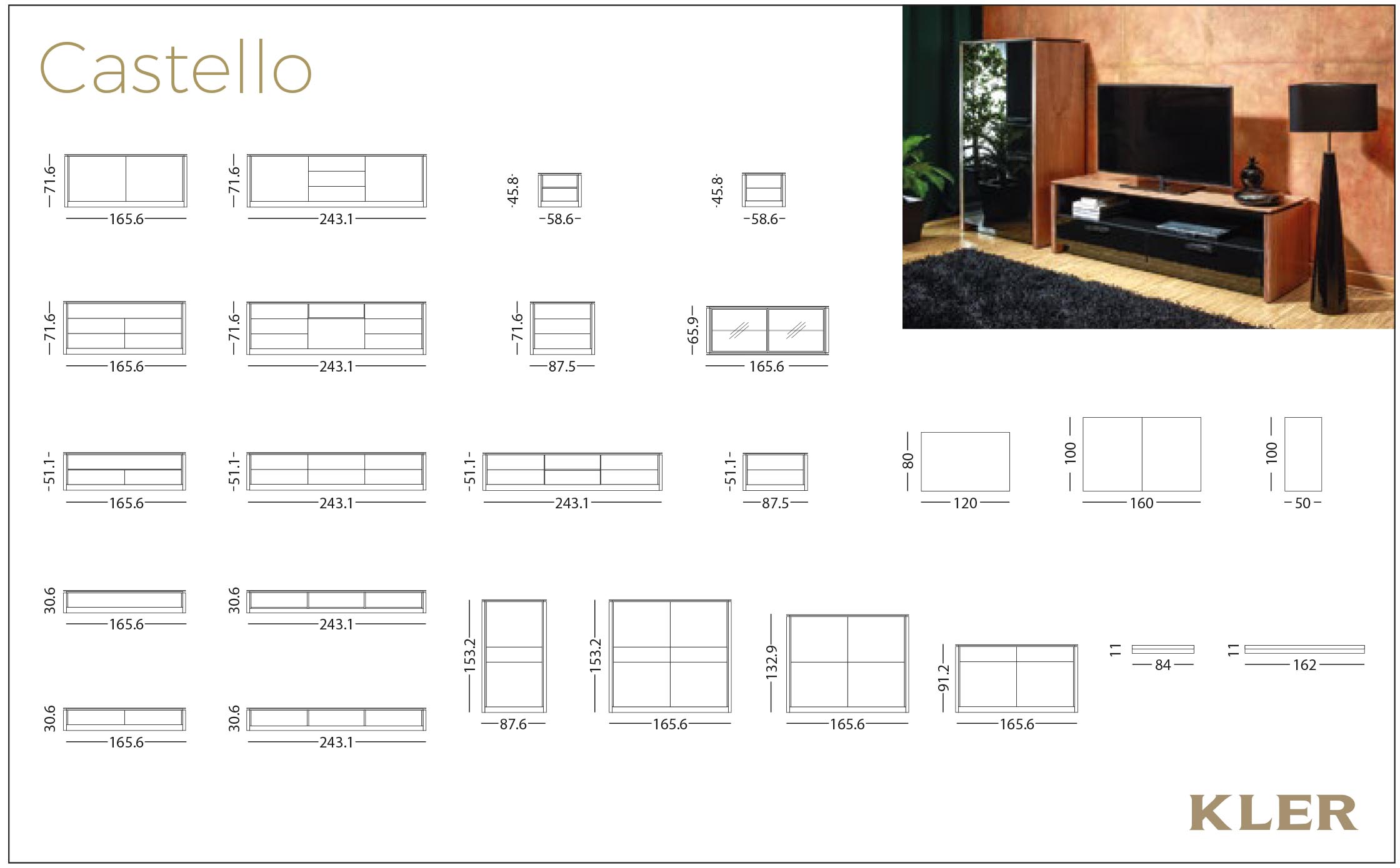Коллекция корпусной мебели Castello по своему дизайну принадлежит к современному стилю. Выглядит мебель очень презентабельно. В серии Castello есть следующие элементы: тумбы под телевизор, буфеты, комоды, шкафы, открытые полки, витрины и тумбочки различных размеров. Их строгая красота не лишена индивидуальности: верхние горизонтальные поверхности визуально отделены от корпуса, а фасады контрастируют с корпусом. Благодаря этой серии мебели можно полностью оформить интерьер большой комнаты или квартиры. Современная форма модели подчёркнута необычными ручками. Castello- это сочетание натуральной отделки дерева (3 цвета на выбор) с фасадами «lacobello». Lacobello - это глянцевая отделка фасадов корпусной мебели (4 цвета на выбор). Есть возможность применения открывания типа push или при помощи ручек. Натуральное дерево корпусной мебели можно выбрать в нашем салоне, цвета: американский орех, дуб чёрно-белый, шпон venge. Все материалы экологичны.