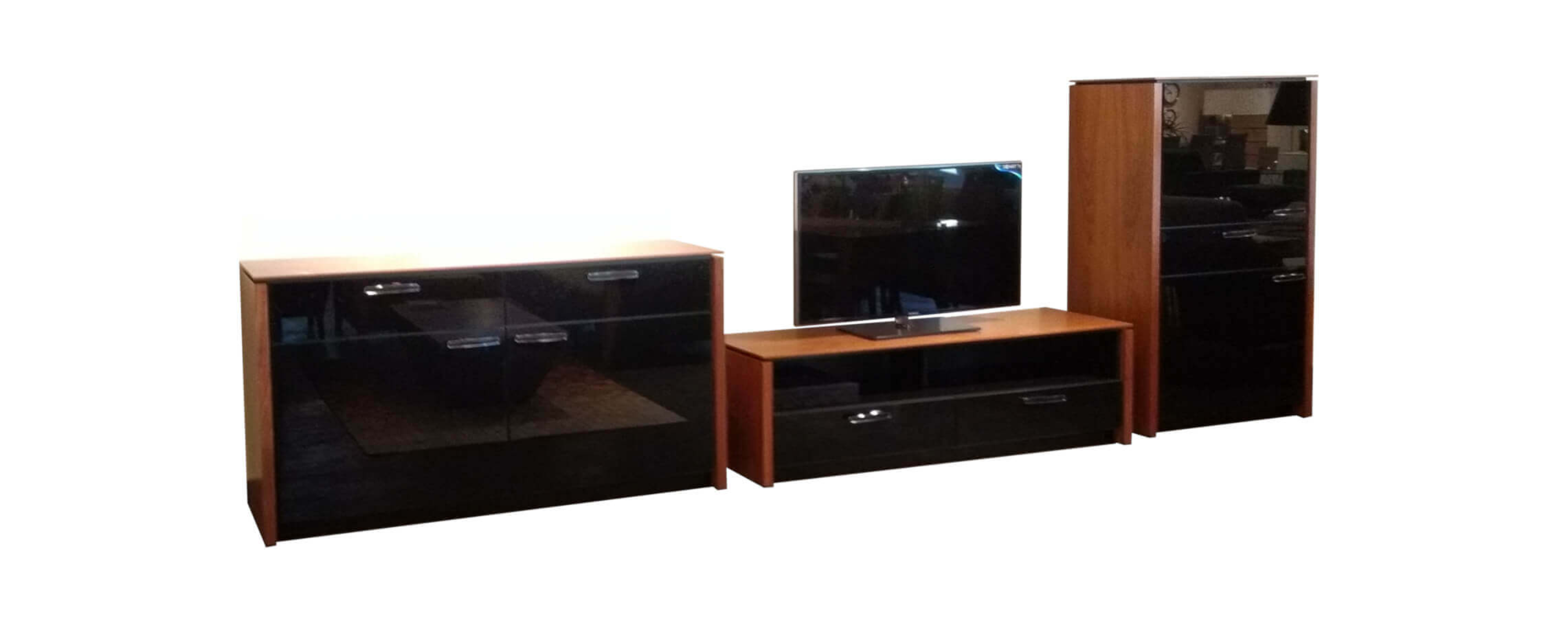 Стенка с глянцевым черным фасадом. Линейная конструкция. Тумбы с выдвижными ящиками.