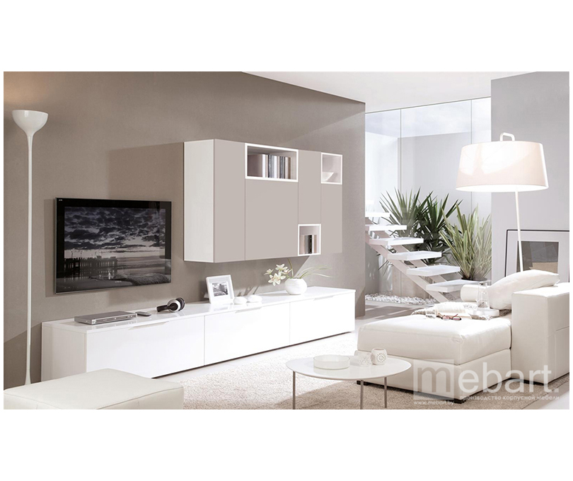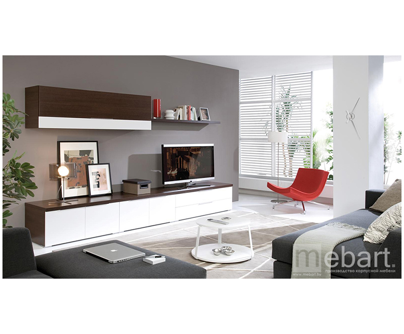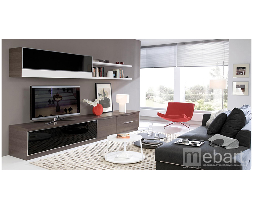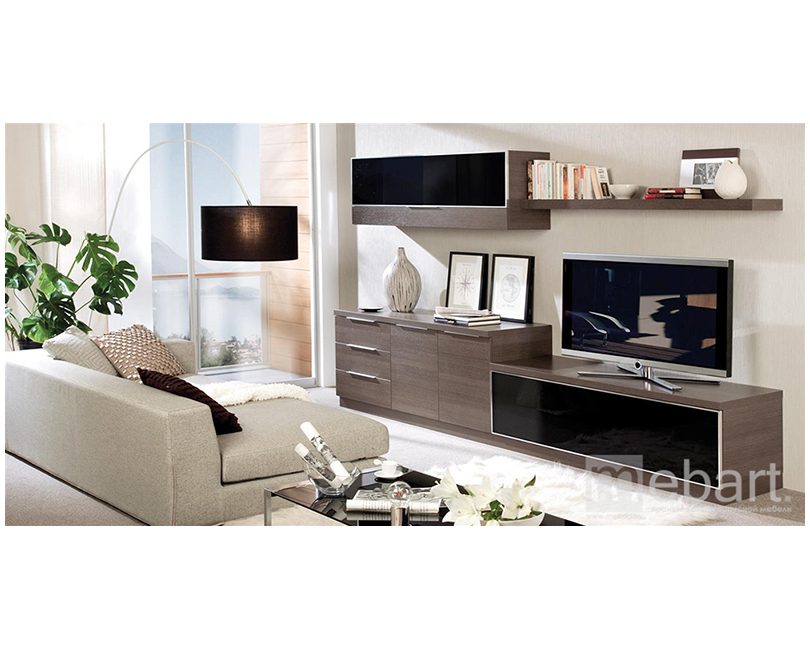 Стильная функциональная стенка отлично впишется в обстановку гостиной. В комплекте имеется тумба под ТВ, тумбочка с открытой нишей для декоративных предметов и подвесная полочка.
