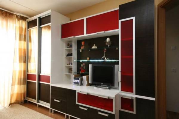 Большая стенка с двумя шкафами: шкаф-купе и платяной. В декоре модели использован красный пластик.