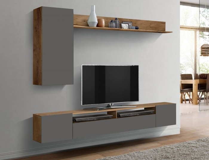 Модель состоит из трех модулей: навесной ТВ-тумбы, шкафчика и полки.