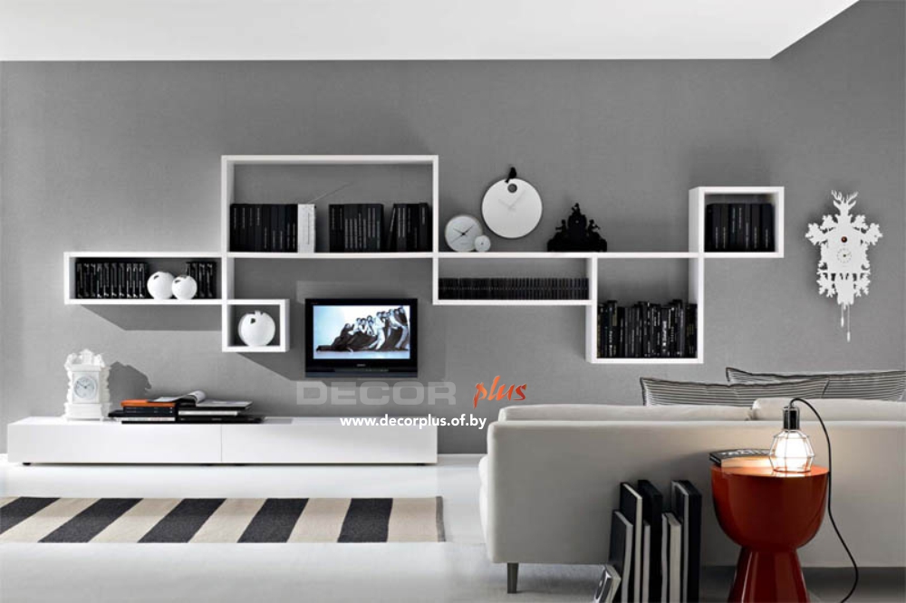 Горка включает напольную тумбу на два выдвижных ящика без ручек и широкий навесной модуль из совмещенных прямоугольных и квадратных ниш. Корпус окрашен в белый матовый цвет. Общий минималистичный стиль конструкции значительно украсит практически любой интерьер.