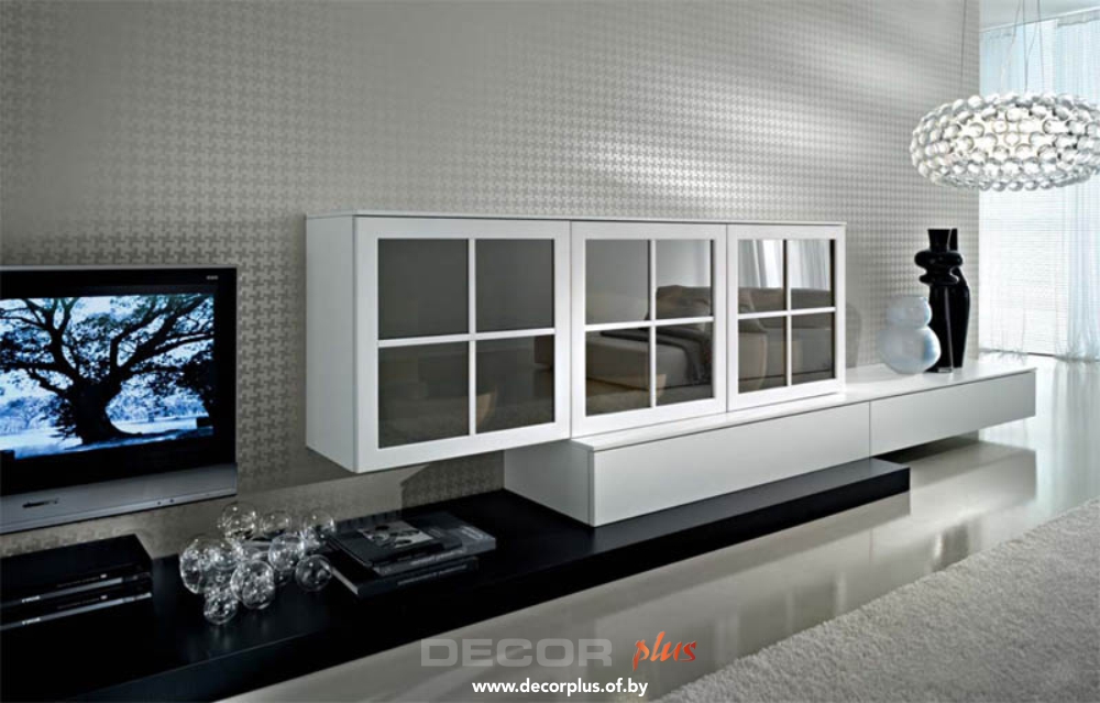 Стильная горка для гостиной на черно-сером слоистом основании, служащем частичной опорой еще двум модулям. Второй блок представляет собой полунавесную тумбу на два выдвижных ящика, на которую, в свою очередь, частично опирается прямоугольный модуль на три квадратных дверцы с рамным остеклением. Фасады без ручек, открытие осуществляется легким нажатием.