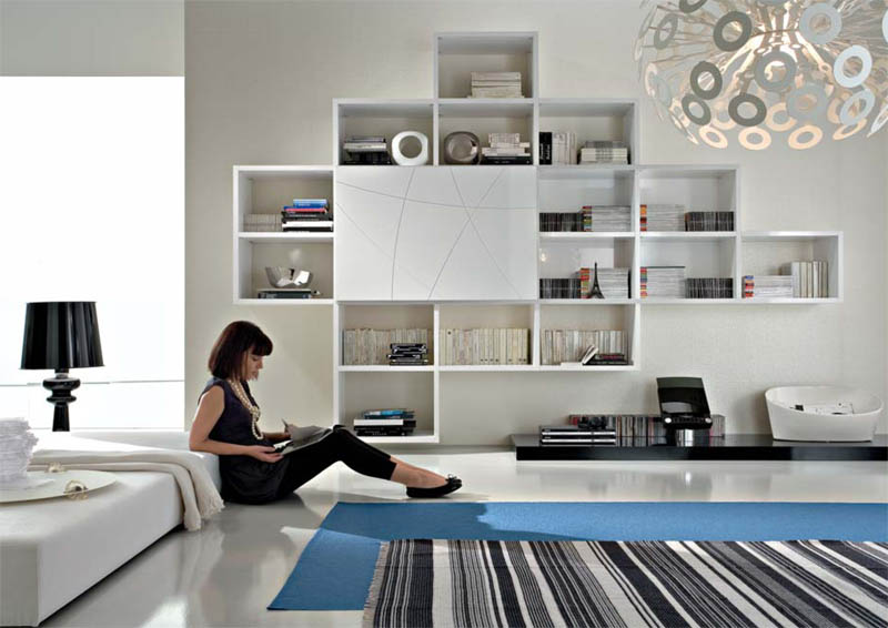 Навесная белая горка со множеством ниш и закрытой секцией с дверцами из лакобеля.