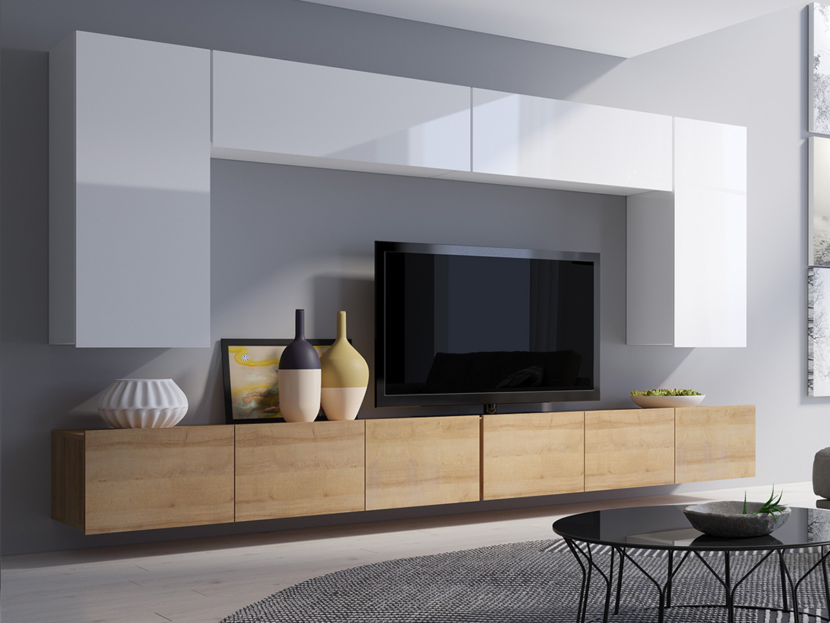 Навесная модель выполнена в стильном минимализме. Нижнюю матовую древесную часть фасада превосходно дополняет верхняя белая в глянце.