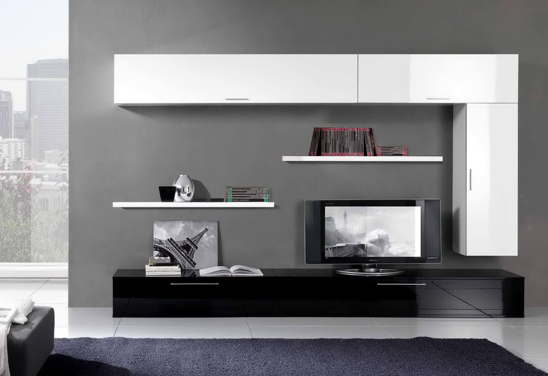 Глянцевые контрастные фасады, широкая ТВ-тумба, подвесные модули, две полки.