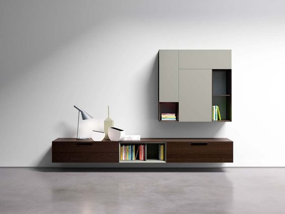 Компактная подвесная ТВ-тумба, подвесной модуль для хранения. Комбинированные фасады.