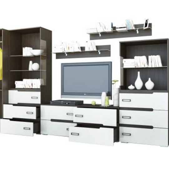 Боковые полки, шкаф, витрина, тумба с выдвижными ящиками, подвесная полка.