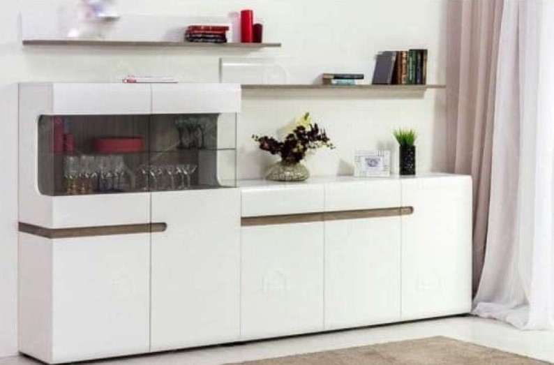 Два остекленных стеллажа, ТВ-тумба, комод, журнальный стол, подвесные полки.