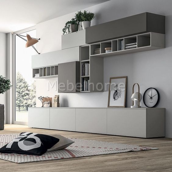 код 107230Матовые серые фасады. Навесные шкафчики разной величины, открытые полки, место для ТВ.