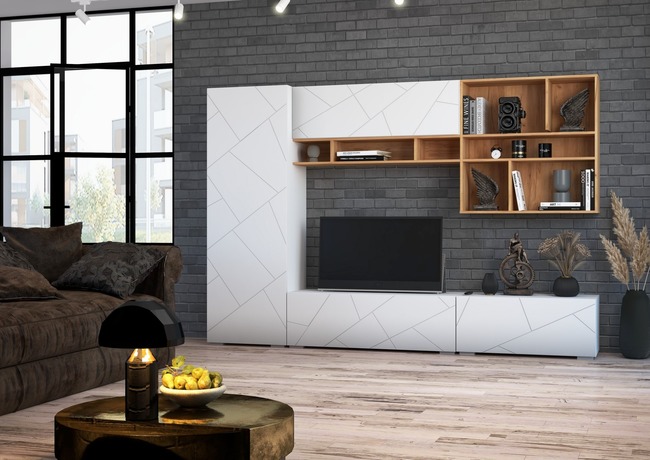 Открытые полки, ниша для ТВ, витрина. Стильный и современный дизайн.
