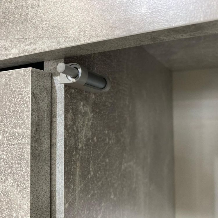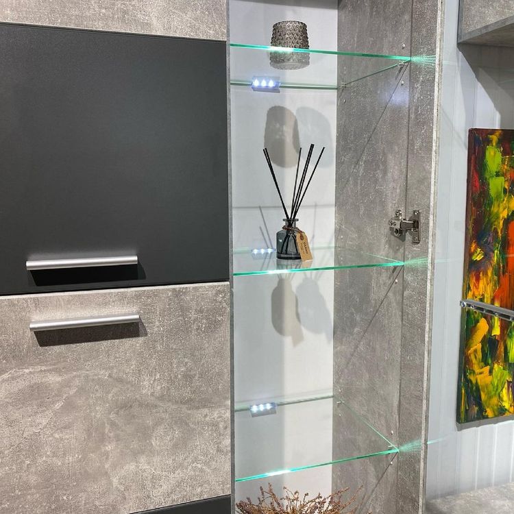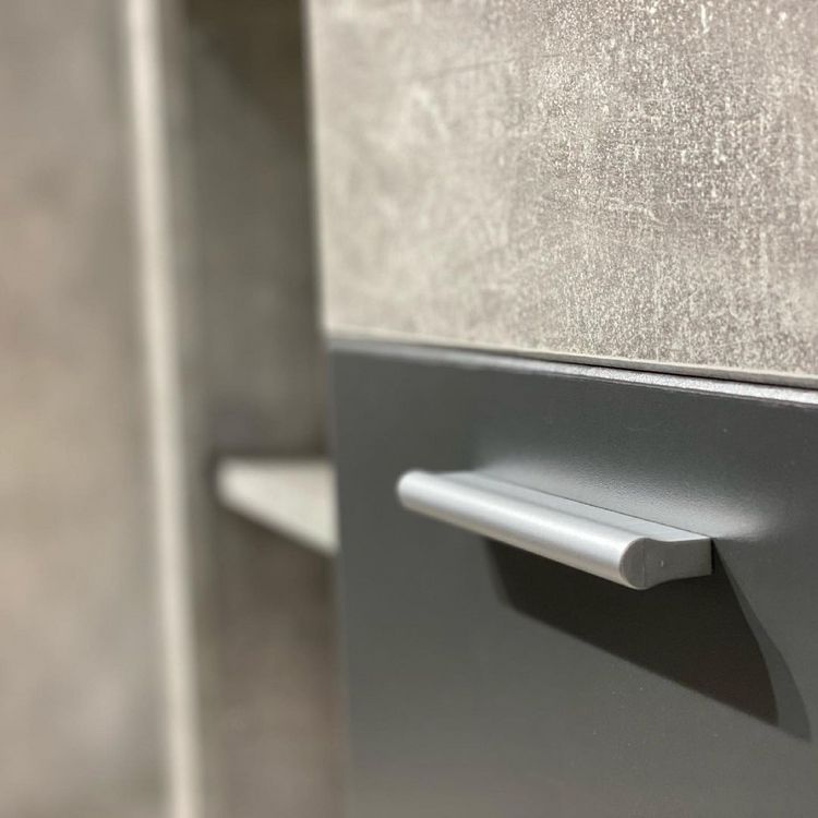 Выполнен в цвете бетон / антрацит. Характеризуется контрастным сочетанием текстур, простыми строгими формами и удобными продолговатыми ручками. Комплектуется LED - подсветкой.