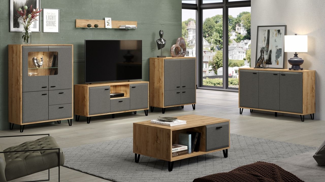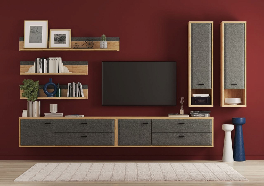 В комплект входит два вместительных шкафа, тумба ТВ, витрины и полки.