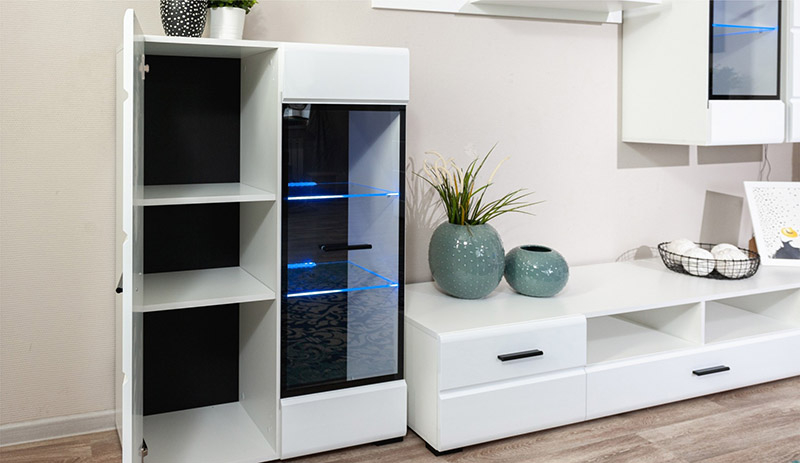 Современная гостиная в светлых тонах. Дополнительная опция: подсветка полок.