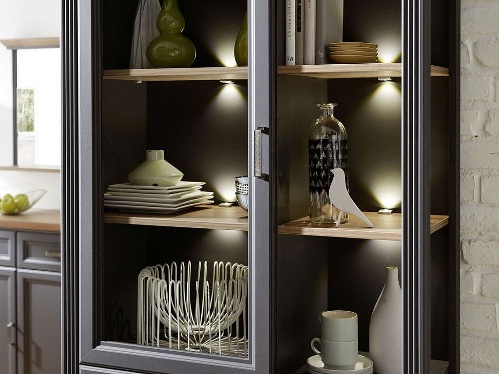 Светлые фасады со шпросами, кованные черные ручки, массивные карнизы темного дерева. Материал: ЛДСП, МДФ.