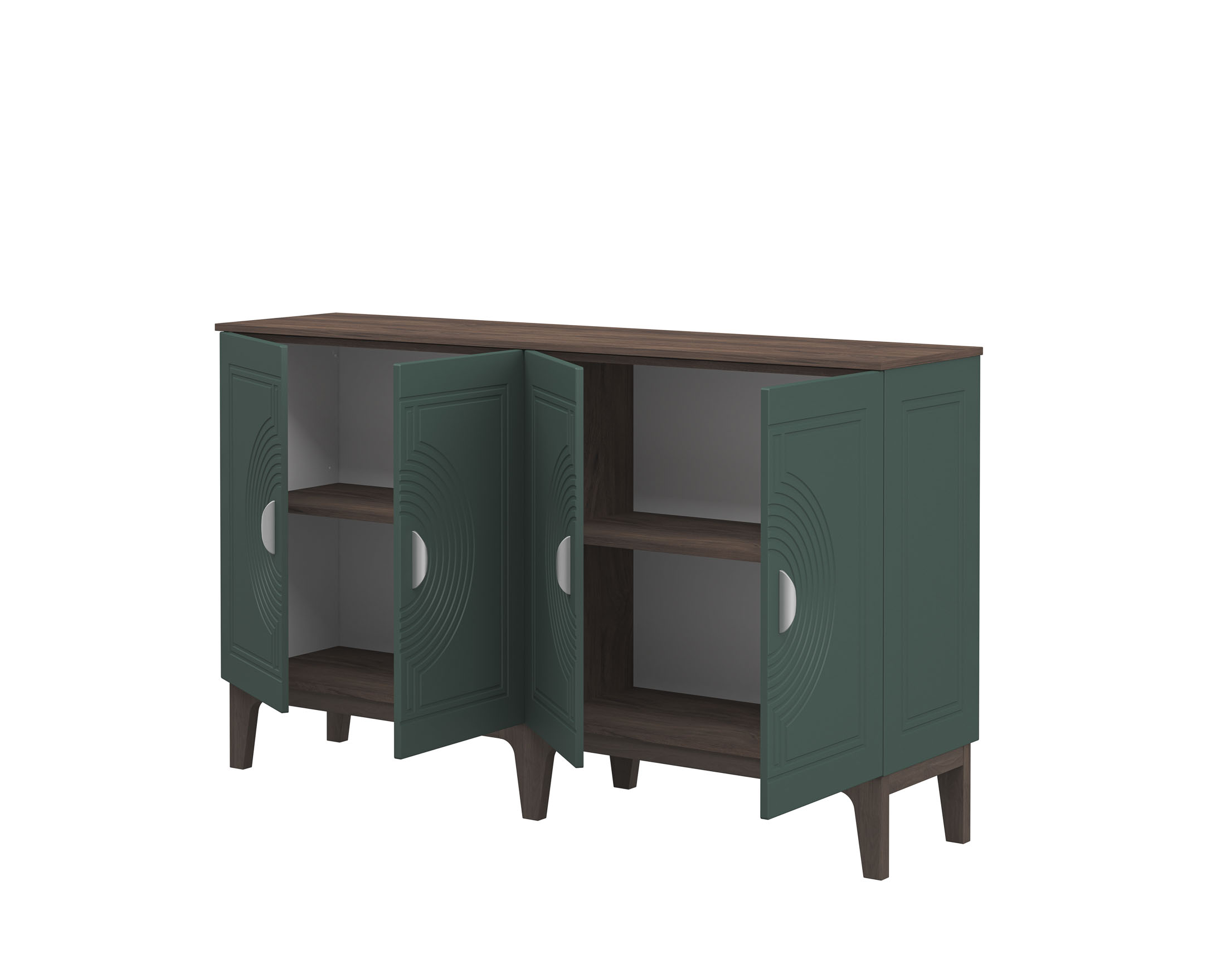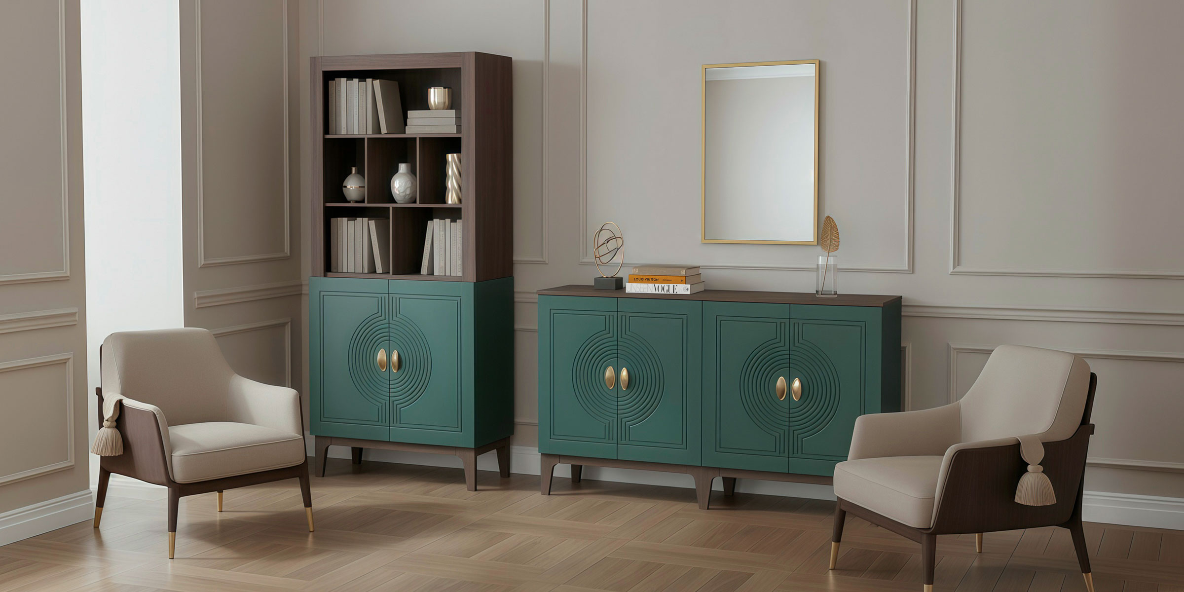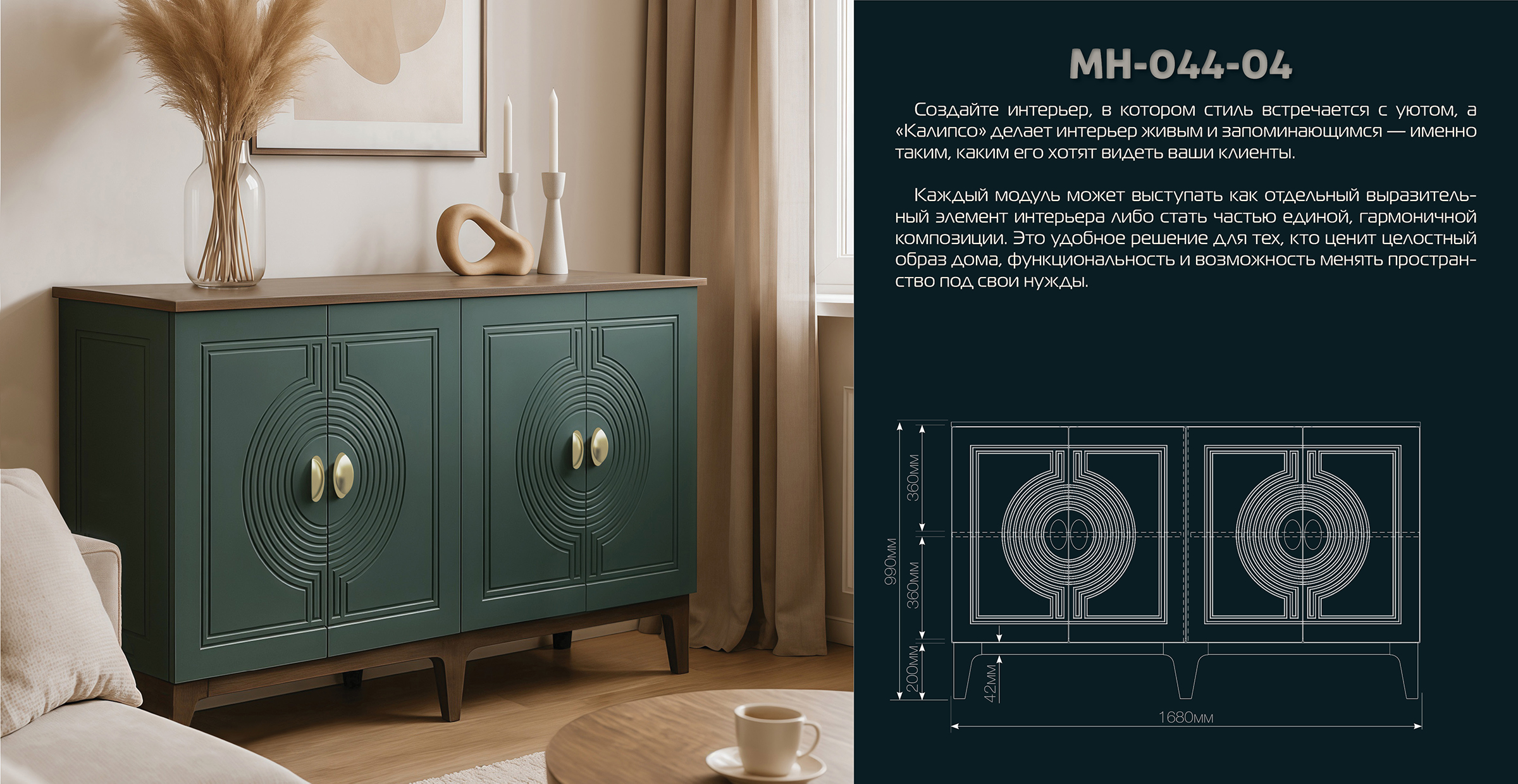 код 155129Калипсо — коллекция для гостиной, в которой выразительность сочетается с утонченностью благодаря теплой текстуре дерева и глубоким зеленым акцентам.