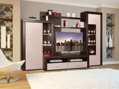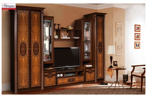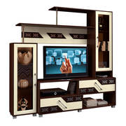 В комплект включены: напольная тумба под телевизор и другую технику, две стеклянные витрины для бьющихся предметов, два различных по размерам шкафа для хранения вещей и навесная полка, созданная для объединения всех деталей и завершения общей композиции.