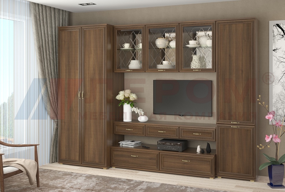 Комплектация: одностворчатый шкаф, двухстворчатый шкаф, тумба под ТВ, навесные пеналы с фацетными витринами. Модульная гостиная «Карина - композиция 23» изготовлена по современным технологиям с применением оригинальных долговечных материалов. Стенка выполнена в стиле модерн с элементами классики, об этом свидетельствуют сдержанность в декоре фасадов и цвет, имитирующий натуральное дерево. Каркас изготовлен из ЛДСП, а декоративные элементы из МДФ с прямоугольными филенками.