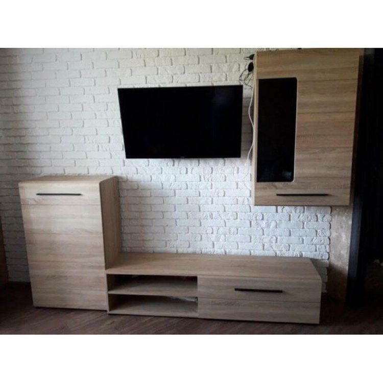 - Тумба под РТВ (ВхШхГ): 38 см / 163 см / 42 см. Состоит из двух открытых отделений и одно за откидной дверью. Вертикальные опорные стенки корпуса соединены горизонтальными крышками. Тумба устанавливается на пластиковые ножки.