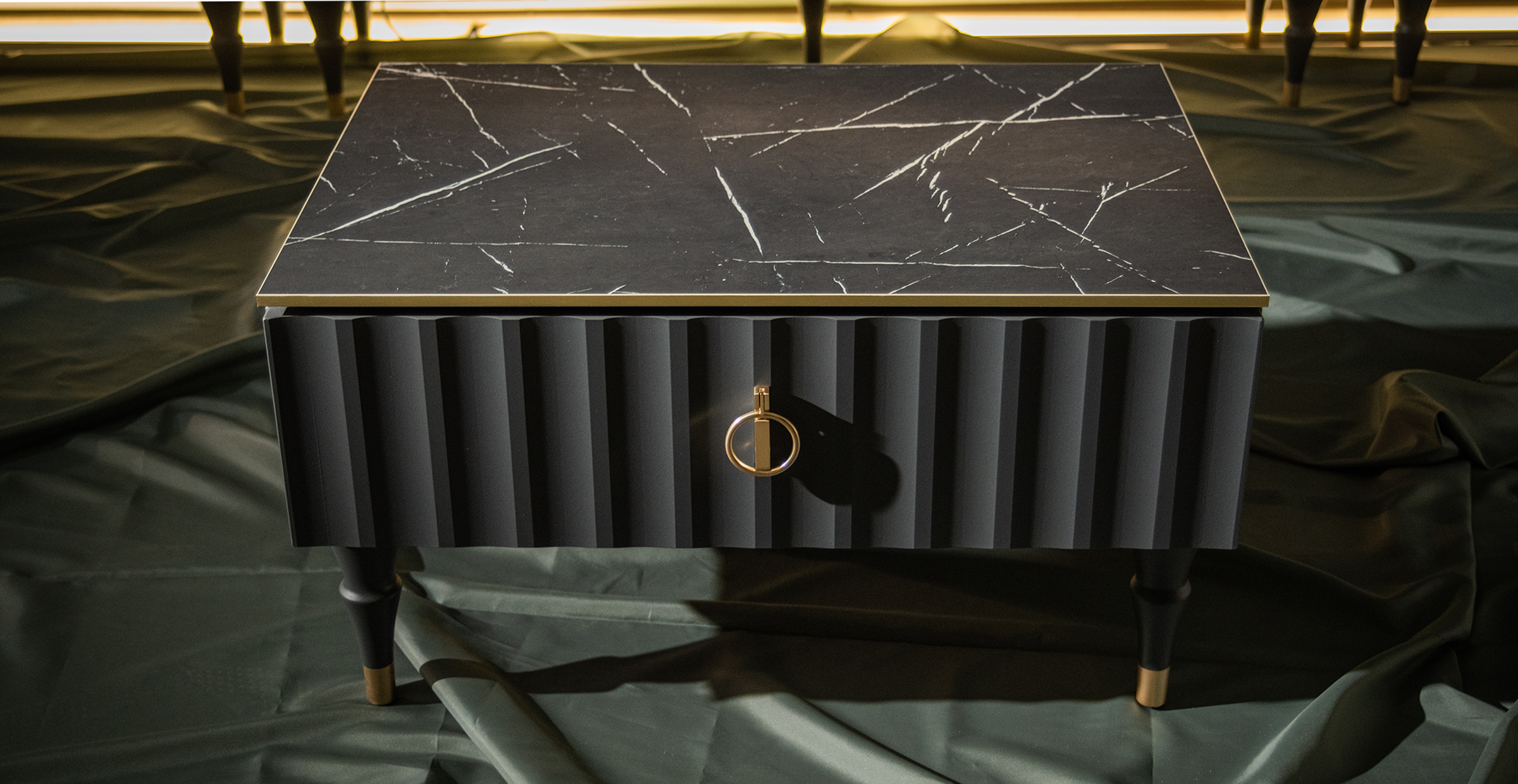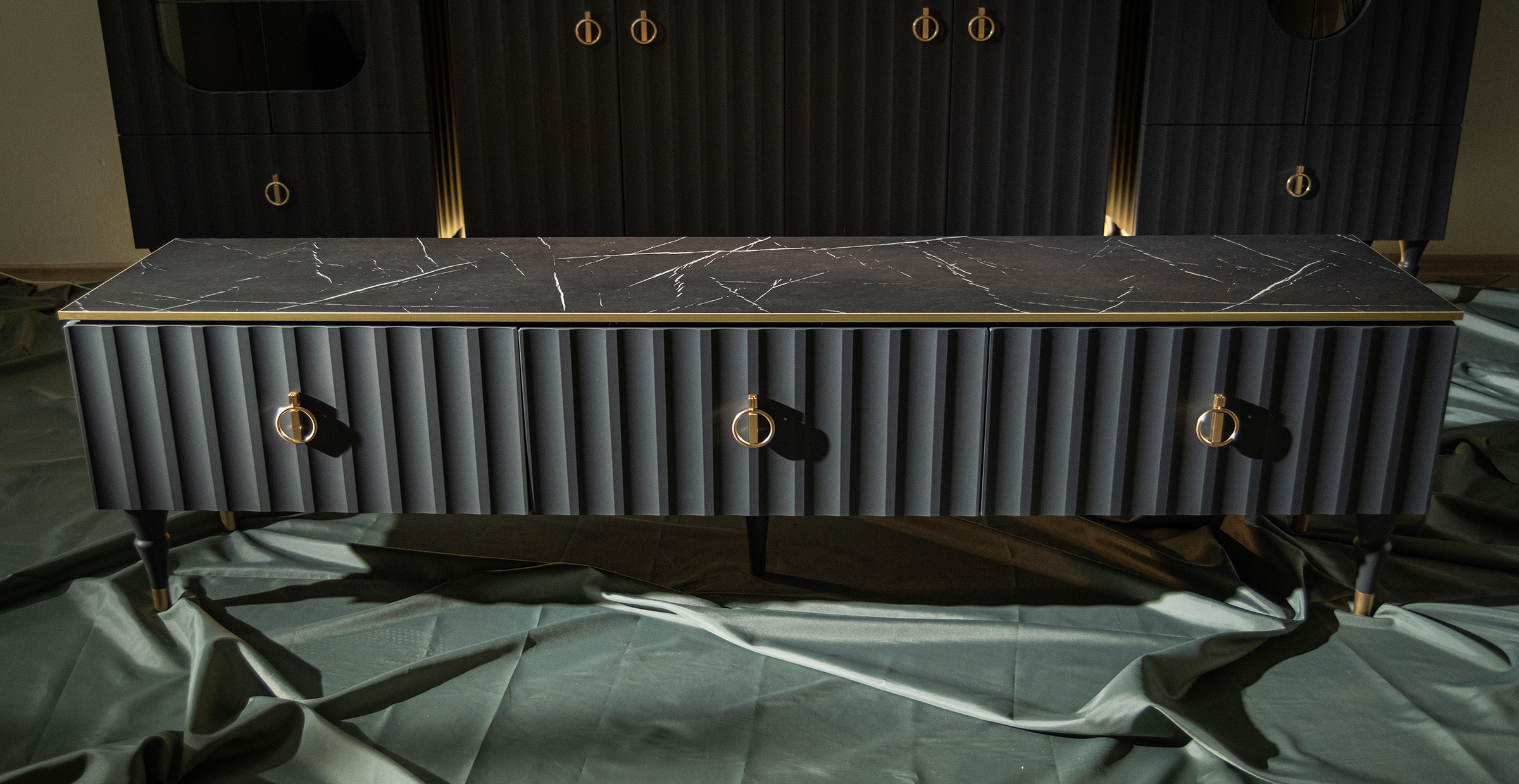 Коллекция мебели Лоренсо – это изысканный дизайн, подчеркнутый золотой металлической линией на изящной утончённой столешнице Мрамор Неро Маркина. Дизайнерские резные ножки из дерева придают коллекции легкость, а инновационное матовое покрытие от итальянских производителей будто приглашает дотронуться до бархатистой волны фасада и ощутить тепло прикосновения. Необычные подвесные шкафы идеально смотрятся вместе, глядя друг на друга прозрачными боковыми витринами, задавая тон всему интерьеру. С мебелью Лоренсо вы окунетесь в атмосферу престижного загородного клуба, где все устроено для вашего комфорта и спокойствия. Мебель Лоренсо – это роскошный фон для вашей жизни.