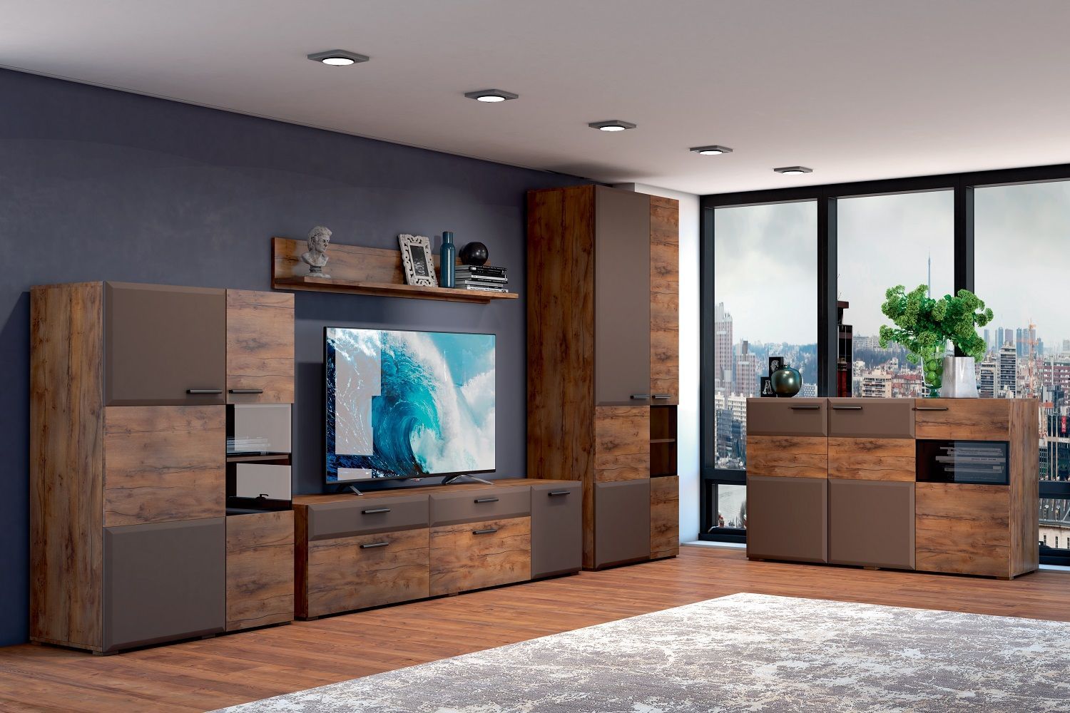 Модульная коллекция мебели в благородном древесном цвете для гостиной. Материал: ЛДСП, МДФ.