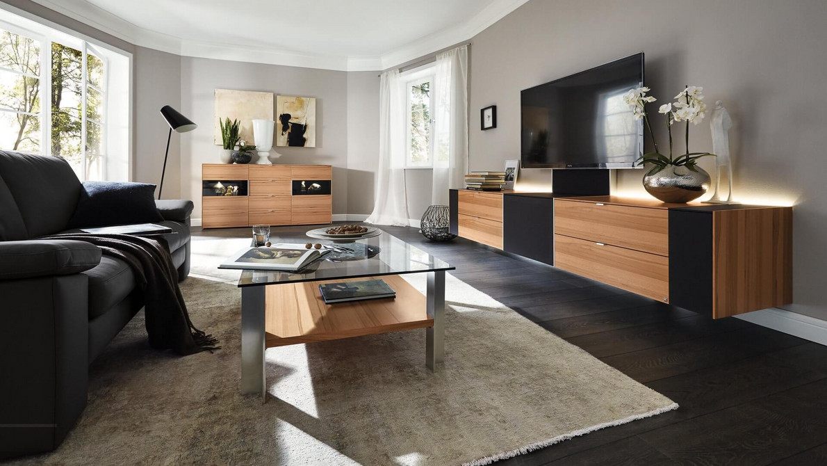 Двухуровневая тумба с прямоугольной крышкой для гостиной с подвесными модулями. Распашные ящики без ручек.