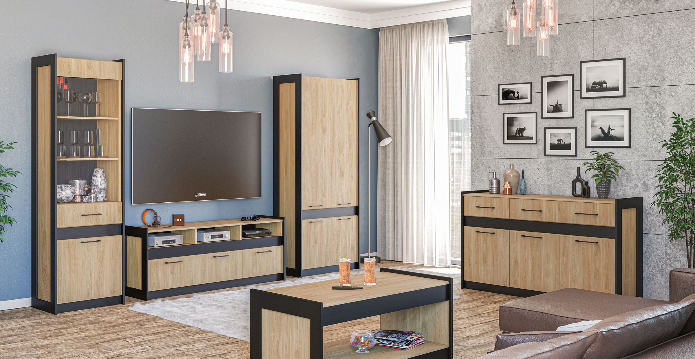 код 151209Современная модульная коллекция в сочетании теплого дуба и черного. Материал: ЛДСП.