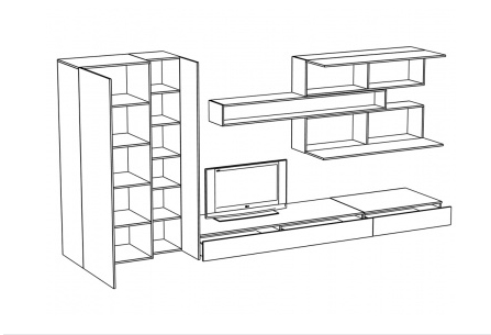 Модульная группа «Nexus 6» состоит из невысокого шкафа, оригинальных настенных полок и широкой полки под ТВ. Все элементы изготовлены из высококачественной ламинированной ДСП и открываются по принципу «нажал-открыл».