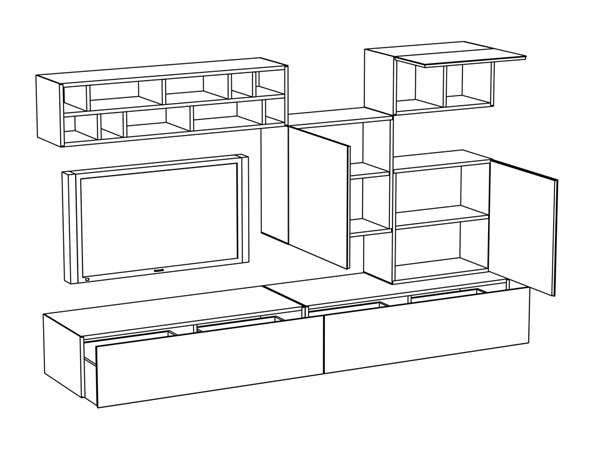 4-х створчатый шкаф, тумба под ТВ, навесная полка, 2-х створчатый шкаф для одежды.