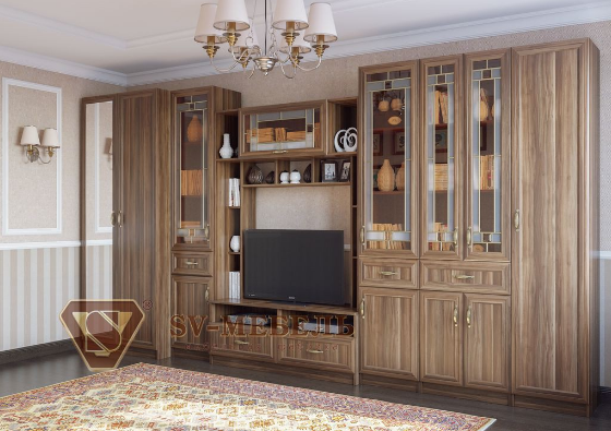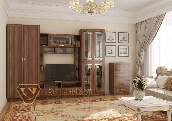Модульная система «Вега» включает в себя два шкафа с полочками и штангой для вешалок, стеклянную витрину для красивой посуды или особо ценных экспонатов коллекционирования, тумбу под теле-видео-аудио аппаратуру, стеллаж для книг, дисков, сувениров, вместительный комод с выдвижными ящиками. Мебель для гостиной выполнена в темном цвете «под натуральное дерево», поэтому выглядит солидно и основательно. Удобные широкие ручки обеспечивают удобное открывание и закрывание дверей. Набирается поэлементно. Модульная гостиная в классическом стиле. Каждый покупатель может подобрать для себя любое количество модулей - пеналы, шкафы, место под ТВ, тумбы, комоды. Её уникальность заключается в том, что модульная серия Вега - это серия, включающая в себя гостиную, спальню, прихожую и даже детскую. Модули всей системы прекрасно дополняют друг друга.