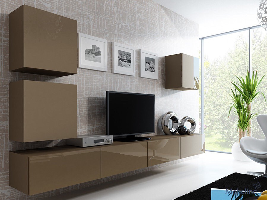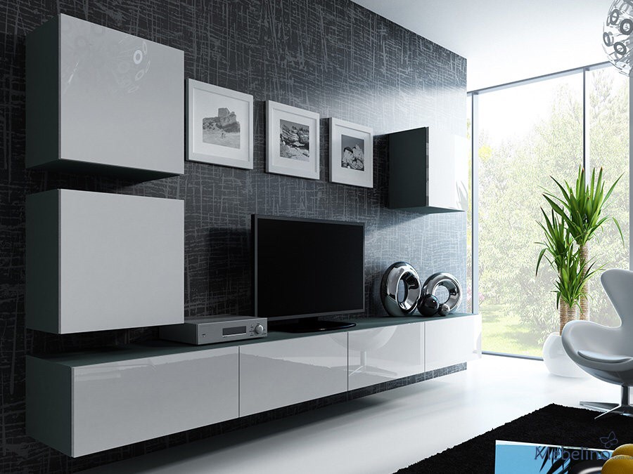 Аккуратная стенка без декоративных деталей – функциональная и простая. Состоит из длинного сегмента, выполняющего роль тумбы под телевизор, и трех подвесных ящиков, которые можно расположить в нужном порядке.