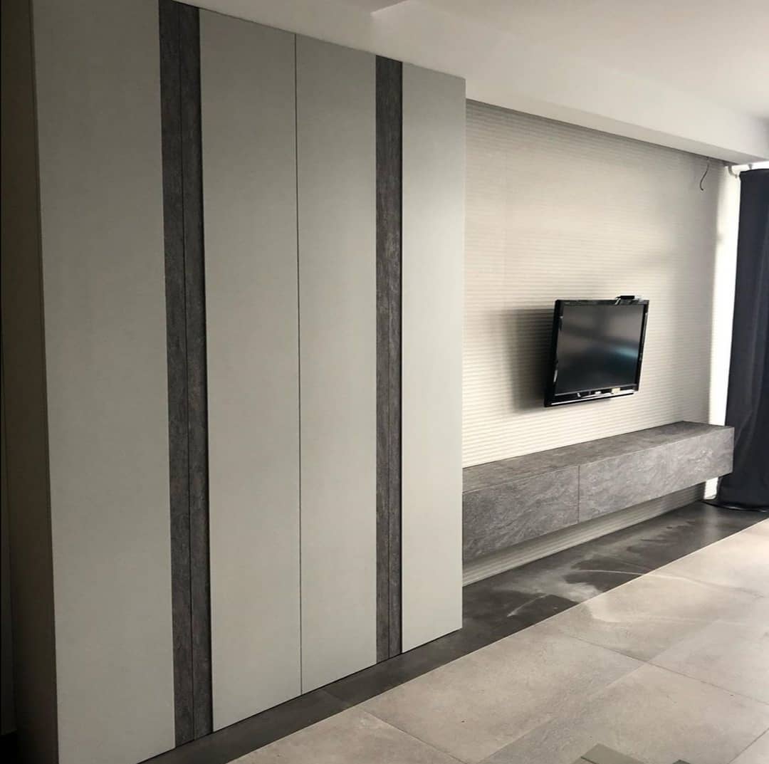 Современная стенка в гостинную. Сочетание гладкого МДФ и глубоких структур природного материала потрясающе. Данная модель отличается большой вместительностью и необычным дизайном.