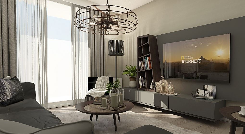 Гостиная в черном и белом цветах. Тумба для ТВ на ножках. Современный стиль.