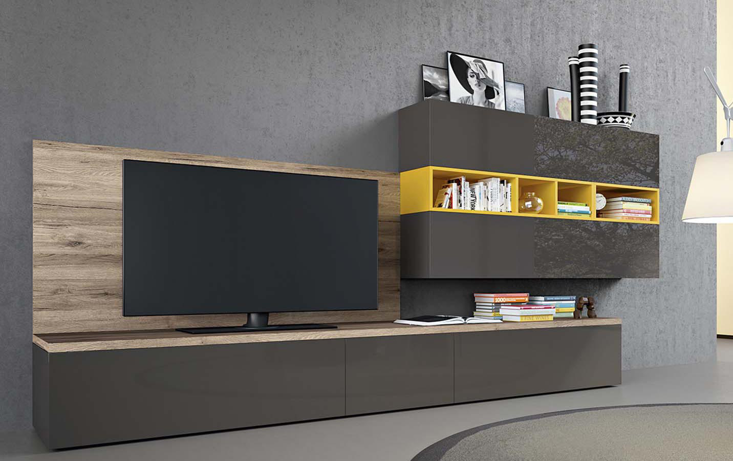 Набор мебели «COXO 14» выполнен в современном стиле, который отлично сочетается с разными интерьерами гостиной. Конструкция состоит из массивной напольной тумбы, выполняющей функции подставки под телевизор, и вместительного настенного шкафа с полками открытого типа. Модель имеет нейтральную темную расцветку со вставкой желтого.