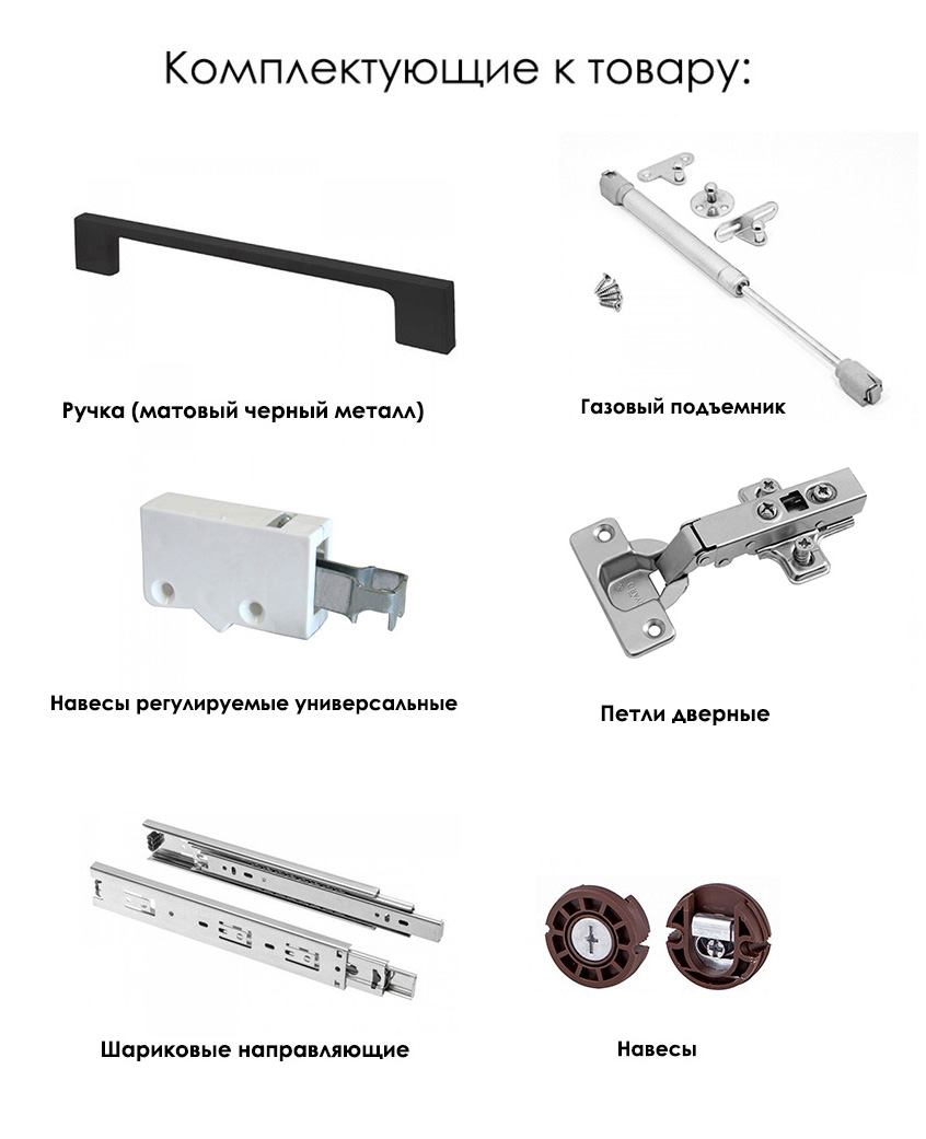 Фурнитура: ручка металлическая черная матовая, шариковые направляющие, опора мебельная, навесы, петли, газовый подъемник, Навесы регулируемые универсальные.