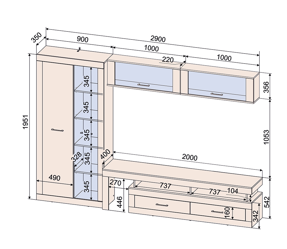 - Шкаф навесной «LT-ШН2» (2 шт.) – Габариты (ШхВхГ): 1000х356х220 мм.