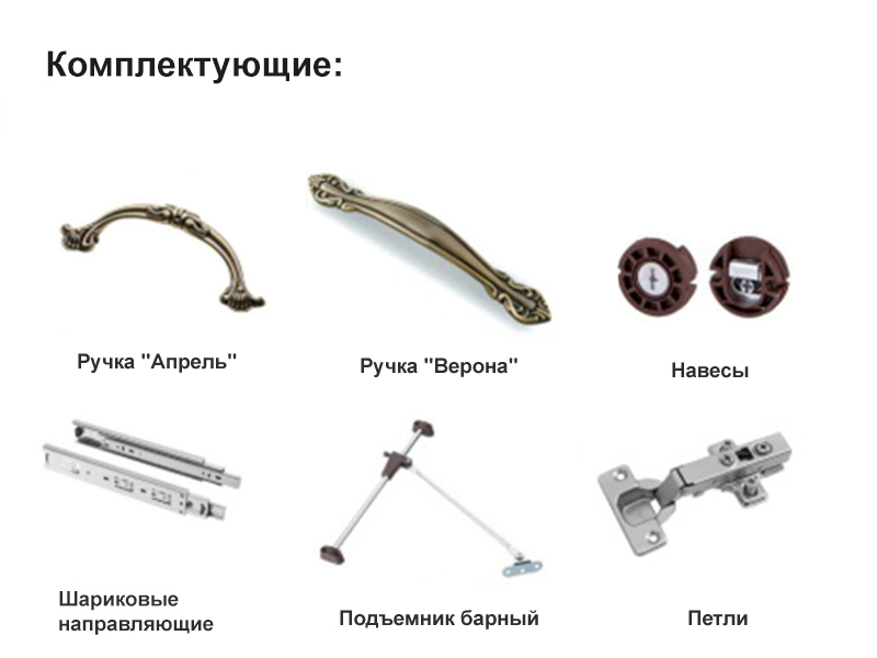 Фурнитура: ручка "апрель", ручка "верона", шариковые направляющие полного выдвижения, подъемник барный, петли, навесы.