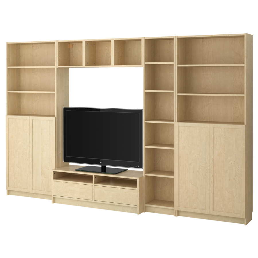 Набор мебели «Билли/Бену», помимо тумбы под TV, включает в себя несколько шкафчиков с множеством открытых полок. Для видеотехники также предусмотрены открытые ниши. Набор мебели изготовлен из ЛДСП, во всех модульных элементах используется качественная и современная фурнитура.