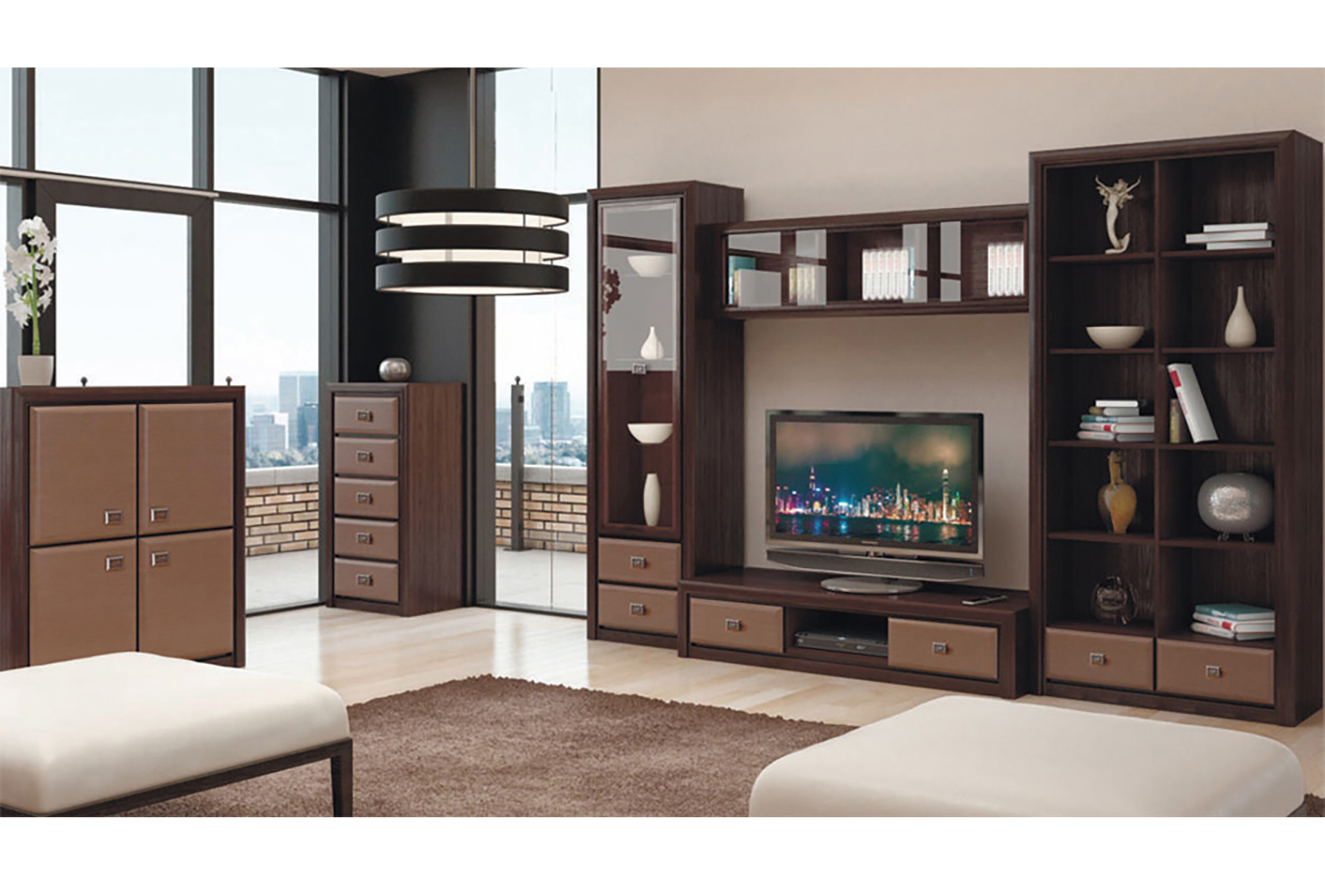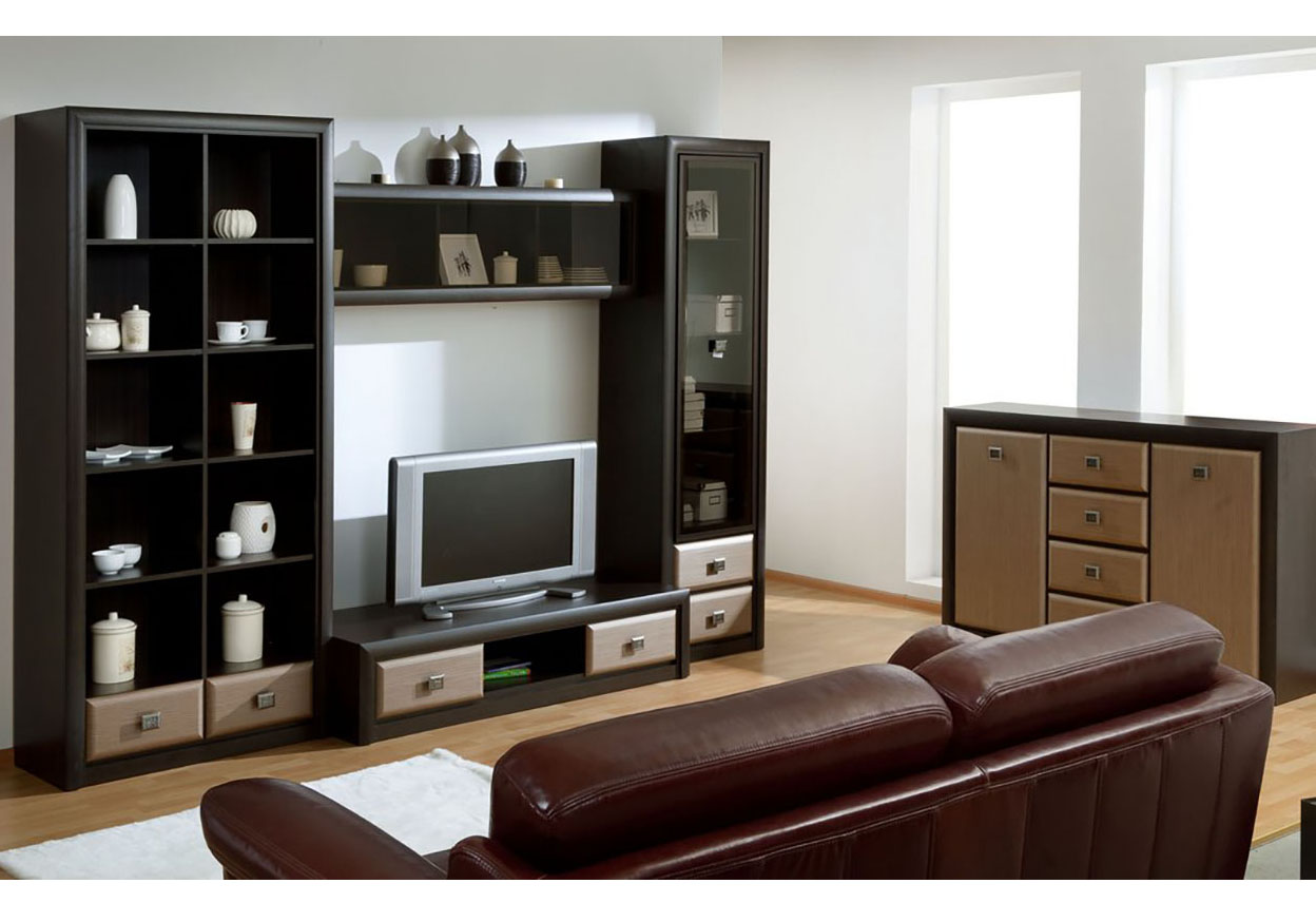 В наборе представлены вместительные шкафы и комод с выдвижными ящиками, а также тумба, трансформирующаяся в подставку под ТВ за счет своего размера.
