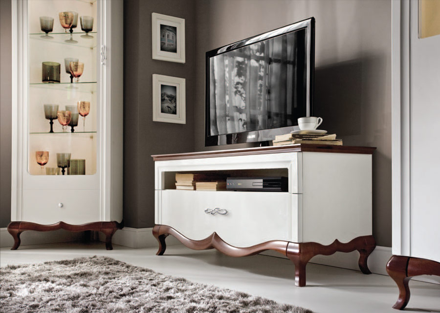 Гостиная в черном и белом цветах. Тумба для ТВ на ножках. Современный стиль.