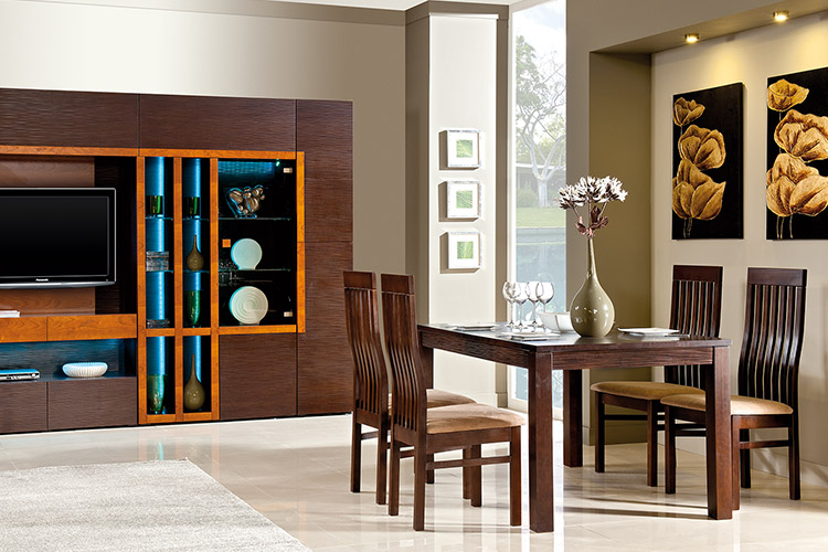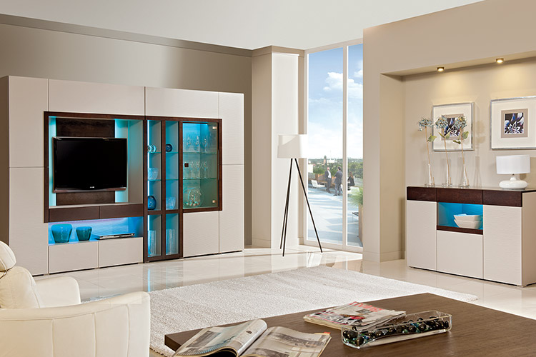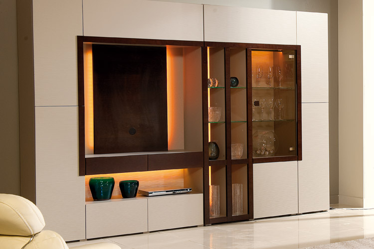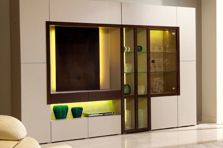 Комбинированные фасады, витрины с подсветкой, открытая полка, ниша для ТВ.