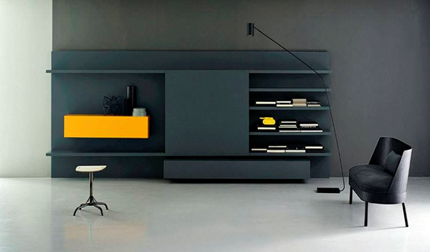 Современный мебельный набор способен украсить любую гостиную. Конструкция состоит из нескольких отдельных элементов, объединенных в общую композицию. Большое количество настенных полок позволяет разместить книги и прочие вещи. Набор выполнен в темной цветовой гамме и имеет яркую вставку в виде желтого подвесного шкафчика.