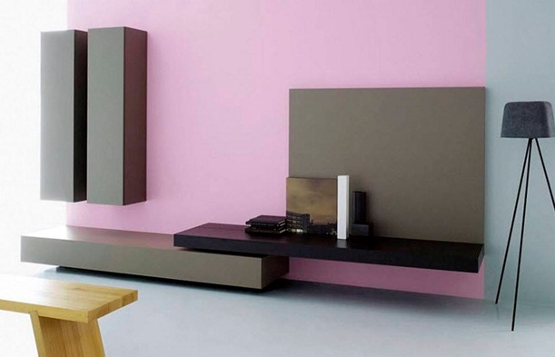 Комплект мебели для гостиной отличается футуристичным дизайном, выполненным в темных тонах. Он состоит из нескольких отдельных модулей: подставки под телевизор, горизонтальной подвесной тумбы и пары вертикальных шкафов.